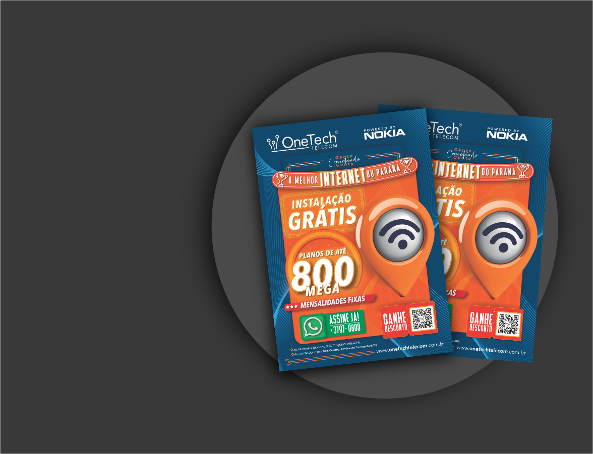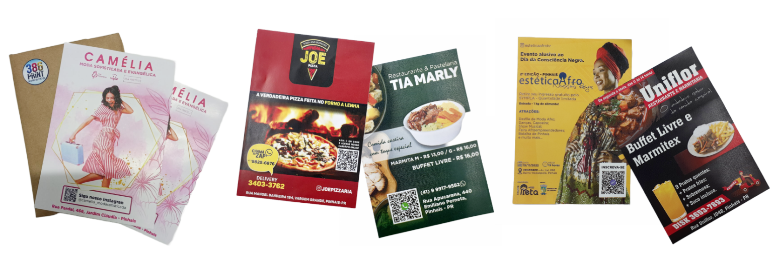 Panfletos, cartões de visita, pastas, banners, cardápios, blocos especiais, imãs de geladeira, papel timbrado, fachadas e muito mais.